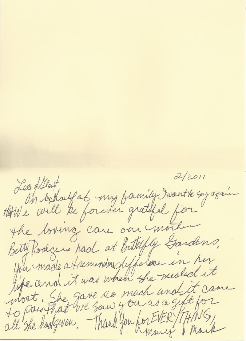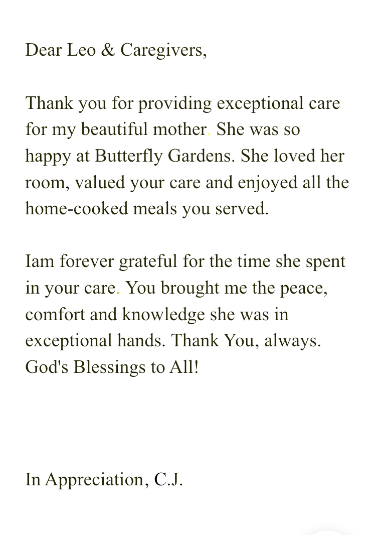 Butterfly Gardens is a wonderful and safe home for our mother. Leo and his wife are such warm and caring people. All the caregivers are kind and long term employees. The home is bright, airy, comfortable and clean. It took us awhile to find this perfect location for our mother and she has adapted better than we ever expected.i