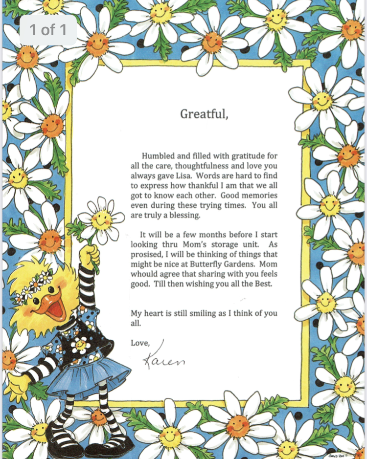 The decision to move my mother to Butterfly Gardens for her care was the best choice I could have made. It was difficult for her to make the move to full care from assisted living as she felt she was "giving up" to her aging and "giving in" to her inability to care for herself.